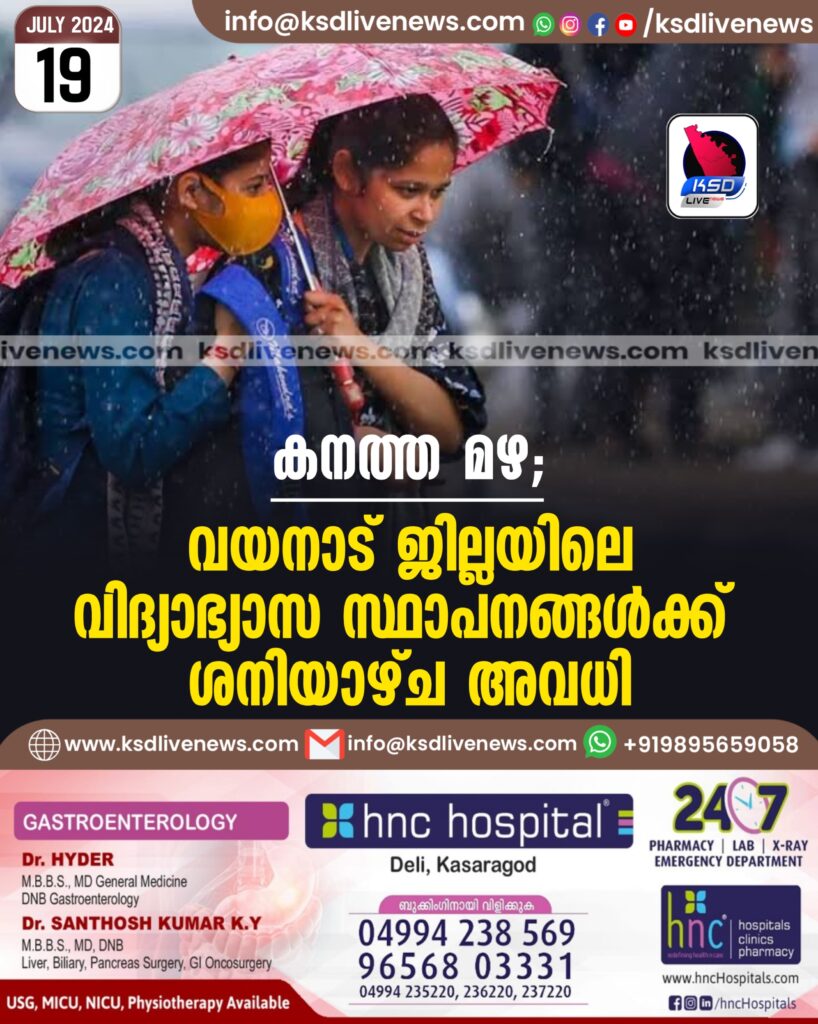 കൽപ്പറ്റ: കനത്ത മഴയെത്തുടര്ന്ന് വയനാട് ജില്ലയിലെ വിദ്യാഭ്യാസ സ്ഥാപനങ്ങള്ക്ക് ശനിയാഴ്ച (ജൂലായ് 20) ജില്ലാ കളക്ടർ അവധി പ്രഖ്യാപിച്ചു. ജില്ലയിലെ പ്രൊഫഷണല് കോളേജുകള്, അംഗന്വാടികള്, ട്യൂഷന് സെന്ററുകള് ഉള്പ്പെടെയുള്ള എല്ലാ വിദ്യാഭ്യാസ സ്ഥാപനങ്ങള്ക്കും അവധിയായിരിക്കും. മുന്കൂട്ടി നിശ്ചയിച്ച പരീക്ഷകള്ക്കും പി.എസ്.സി. പരീക്ഷകള്ക്കും അവധി ബാധകമല്ല. മോഡല് റസിഡന്ഷ്യല് (എം.ആര്.എസ്), നവോദയ സ്കൂളുകള്ക്ക് അവധി ബാധകമല്ല.