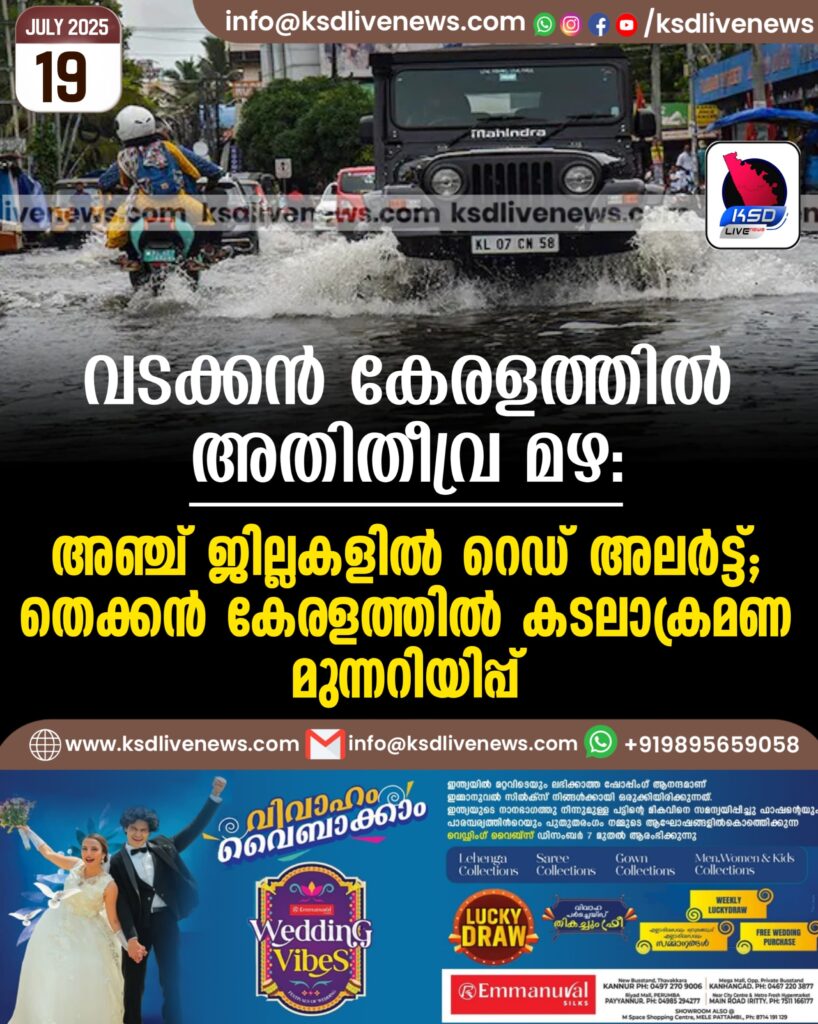 വടക്കൻ കേരളത്തിൽ അതിതീവ്ര മഴ; അഞ്ച് ജില്ലകളിൽ റെഡ് അലർട്ട്; തെക്കൻ കേരളത്തിൽ കടലാക്രമണ മുന്നറിയിപ്പ്