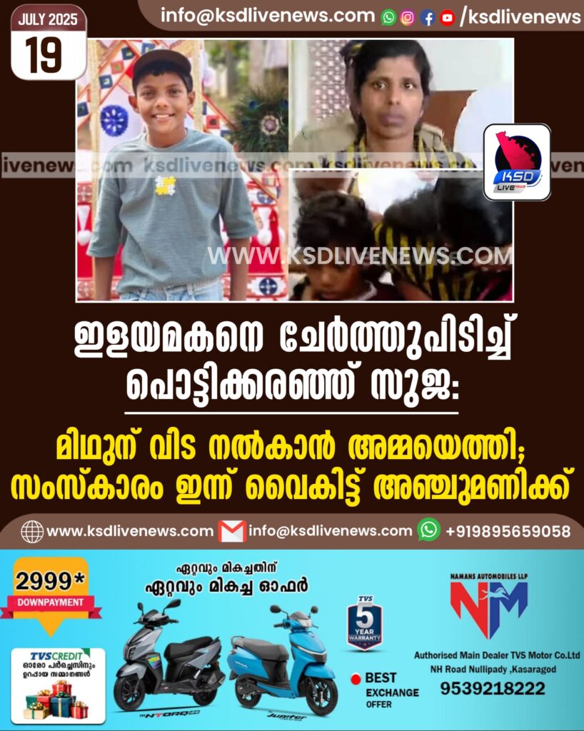 ഇളയമകനെ ചേർത്തുപിടിച്ച് പൊട്ടിക്കരഞ്ഞ് സുജ: മിഥുന് വിട നൽകാൻ അമ്മയെത്തി; സംസ്കാരം ഇന്ന് വൈകിട്ട് അഞ്ചുമണിക്ക്