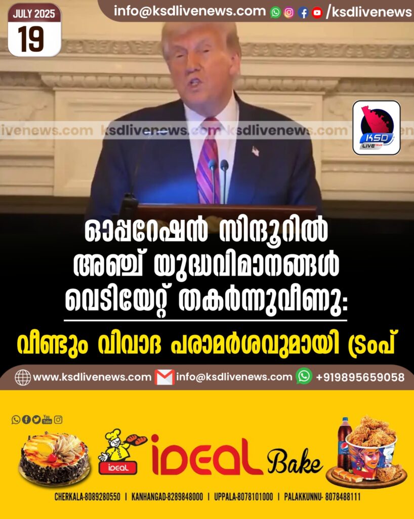ഓപ്പറേഷൻ സിന്ദൂറില് അഞ്ച് യുദ്ധവിമാനങ്ങള് വെടിയേറ്റ് തകര്ന്നുവീണു: വീണ്ടും വിവാദ പരാമര്ശവുമായി ട്രംപ്