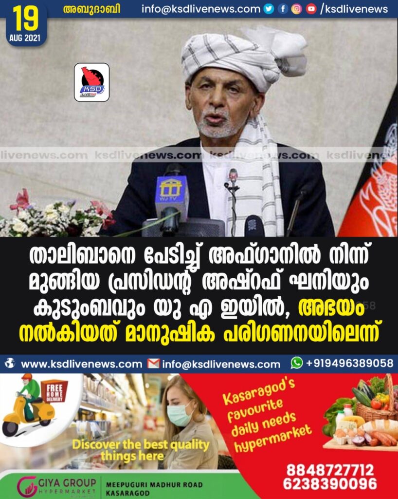 താലിബാനെ പേടിച്ച്‌ അഫ്ഗാനില്‍ നിന്ന് മുങ്ങിയ പ്രസിഡന്റ് അഷ്റഫ് ഘനിയും കുടുംബവും യു എ ഇയില്‍, അഭയം നല്‍കിയത് മാനുഷിക പരിഗണനയിലെന്ന്