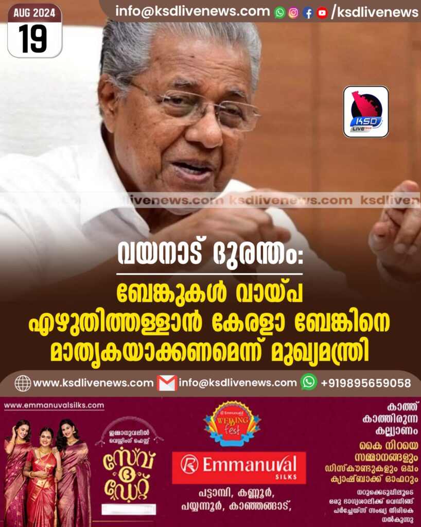 വയനാട് ദുരന്തം: ബേങ്കുകള് വായ്പ എഴുതിത്തള്ളാന് കേരളാ ബേങ്കിനെ മാതൃകയാക്കണമെന്ന് മുഖ്യമന്ത്രി