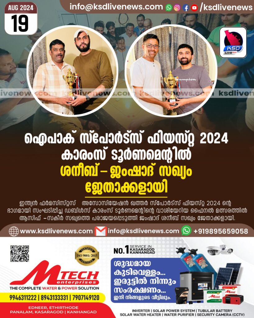 ഐപാക് സ്പോർട്സ് ഫിയസ്റ്റ 2024 കാരംസ് ടൂർണമെന്റിൽ ശനീബ്-ജംഷാദ് സഖ്യം ജേതാക്കളായി