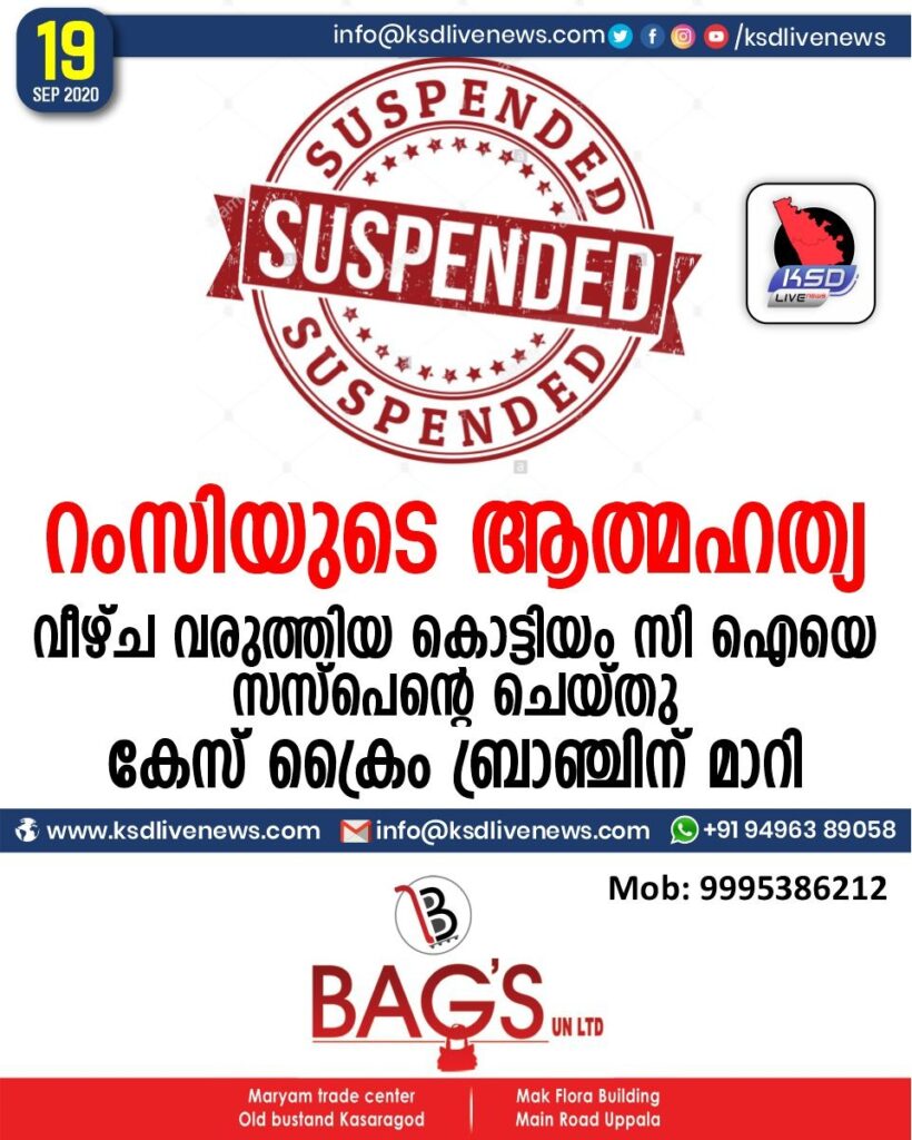 റംസിയുടെ ആത്മഹത്യ : റംസിയുടെ ആത്മഹത്യയുമായി ബന്ധപ്പെട്ടുള്ള ആത്മഹത്യയിൽ അന്വേഷണത്തിൽ വീഴ്ച വരുത്തിയ ഉദ്യോഗസ്ഥനെതിരെ നടപടി . കൊട്ടിയം സി.ഐ.യെ. സസ്പെന്റ് ചെയ്തു . അന്വേഷണം ക്രൈംബ്രാഞ്ചിന് കൈമാറി . റംസി ആത്മഹത്യ ചെയ്ത സംഭവത്തിൽ സീരിയൽ നടിക്കെതിരായ സ്പെഷ്യൽ ബ്രാഞ്ച് റിപ്പോർട്ടക്കമുള്ള കാര്യങ്ങൾ അവഗണിച്ചതിനാണ് സി.ഐ.ദിലീഷിനെ സസ്പെന്റ് ചെയ്തത് . നടി ഒളിവിൽ പോയതും പിന്നാലെ മുൻകൂർ ജാമ്യാപേക്ഷ കോടതിയിലെത്തിയതും പൊലീസ് നിരീക്ഷണത്തിലിരിക്കവേയാണ് സി.ഐ.ക്ക് തിരിച്ചടിയായി . കഴിഞ്ഞ ദിവസം വൈകിട്ട് ആറിന് പൊലീസ് ആസ്ഥാനത്ത് നിന്നും സി.ഐ.ക്ക് സസ്പെൻഷൻ ഉത്തരവിറങ്ങി . ഇതിന് തൊട്ടുപിന്നാലെ കേസ് ക്രൈംബ്രാഞ്ചിന് വിട്ടുകൊണ്ട് കൊല്ലം സിറ്റി പൊലീസ് കമ്മീഷണർ ഉത്തരവിറക്കി . ക്രൈംബ്രാഞ്ച് അസിസ്റ്റന്റ് കമ്മീഷണർ ടി.ആർ.അഭിലാഷിനാണ് അന്വേഷണ ചുമതല . അതേസമയം കേസിൽ അന്വേഷ . ആരോപണം നേരിടുന്ന നടി ലക്ഷ്മി പ്രമോദ് പ്രതി ഹാരിസ് മുഹമ്മദിന്റെ മാതാവ് എന്നിവരുടെ ജാമ്യാപേക്ഷ ഈ വരുന്ന 23 ന് കൊല്ലം ജില്ല പ്രിൻസിപ്പൽ സെഷൻസ് കോടതി പരിഗണിക്കും