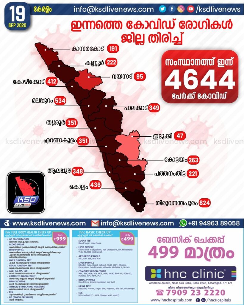 തിരുവനന്തപുരം: കേരളത്തില് ഇന്ന് 4644 പേര്ക്ക് കോവിഡ്-19 സ്ഥിരീകരിച്ചതായി മുഖ്യമന്ത്രി പിണറായി വിജയന്. തിരുവനന്തപുരം 824, മലപ്പുറം 534, കൊല്ലം 436, കോഴിക്കോട് 412, തൃശൂര്, എറണാകുളം 351 വീതം, പാലക്കാട് 349, ആലപ്പുഴ 348, കോട്ടയം 263, കണ്ണൂര് 222, പത്തനംതിട്ട 221, കാസര്ഗോഡ് 191, വയനാട് 95, ഇടുക്കി 47 എന്നിങ്ങനേയാണ് ജില്ലകളില് ഇന്ന് രോഗ ബാധ സ്ഥിരീകരിച്ചത്.
