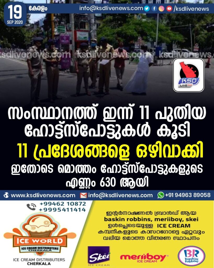 ഇന്ന് 27 പുതിയ ഹോട്ട് സ്പോട്ടുകളാണുള്ളത്. പാലക്കാട് ജില്ലയിലെ അമ്പലപ്പാറ (കണ്ടൈന്മെന്റ് സോണ് വാര്ഡ് 1), കൊടുവായൂര് (18), ഓങ്ങല്ലൂര് (2, 22), തൃത്താല (3), വടക്കരപ്പതി (15), കേരളശേരി (10, 13), കോട്ടയം ജില്ലയിലെ ചങ്ങനാശേരി മുന്സിപ്പാലിറ്റി (31, 33), ഏറ്റുമാനൂര് മുന്സിപ്പാലിറ്റി (23), മുണ്ടക്കയം (20), ഭരണങ്ങാനം (6), വെച്ചൂര് (2), തൃശൂര് ജില്ലയിലെ കൊടുങ്ങല്ലൂര് മുന്സിപ്പാലിറ്റി (14, 15, 16), കടപ്പുറം (11), കൊടകര (1, 2 (സബ് വാര്ഡ്), വല്ലച്ചിറ (4), മറ്റത്തൂര് (സബ് വാര്ഡ് 2), ആലപ്പുഴ ജില്ലയിലെ ചെട്ടികുളങ്ങര (7, 15 (സബ് വാര്ഡുകള്), 1, 11, 14), ചെറിയനാട് (സബ് വാര്ഡ് 10), മാരാരിക്കുളം നോര്ത്ത് (സബ് വാര്ഡ് 13), പത്തനംതിട്ട ജില്ലയിലെ അയിരൂര് (9), റാന്നി (1, 13), കവിയൂര് (സബ് വാര്ഡ് 2), മലപ്പുറം ജില്ലയിലെ കവന്നൂര് (6), ആലംകോട് (4), മറയൂര് (8), എറണാകുളം ജില്ലയിലെ പോത്താനിക്കാട് (സബ് വാര്ഡ് 12), വയനാട് ജില്ലയിലെ തരിയോട് (സബ് വാര്ഡ് 9, 10, 12) എന്നിവയാണ് പുതിയ ഹോട്ട് സ്പോട്ടുകള്.11 പ്രദേശങ്ങളെ ഹോട്ട് സ്പോട്ടില് നിന്നും ഒഴിവാക്കിയിട്ടുണ്ട്. ഇതോടെ നിലവില് 630 ഹോട്ട് സ്പോട്ടുകളാണുള്ളത്.