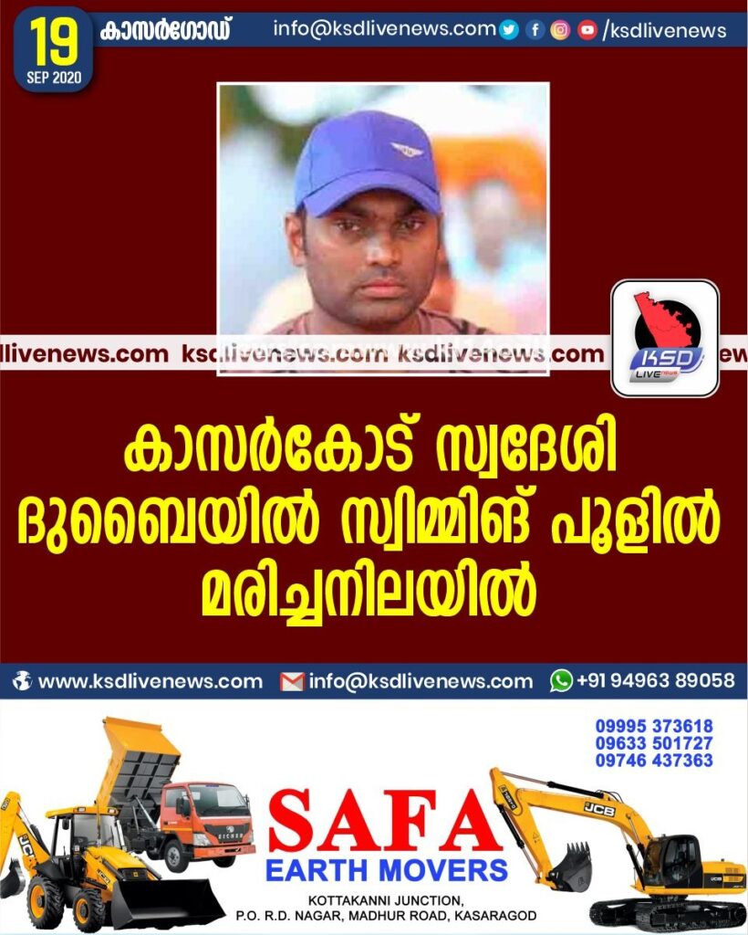 കാസർകോട് സ്വദേശി ദുബൈയിൽ സ്വിമ്മിങ് പൂളിൽ മരിച്ചനിലയിൽ