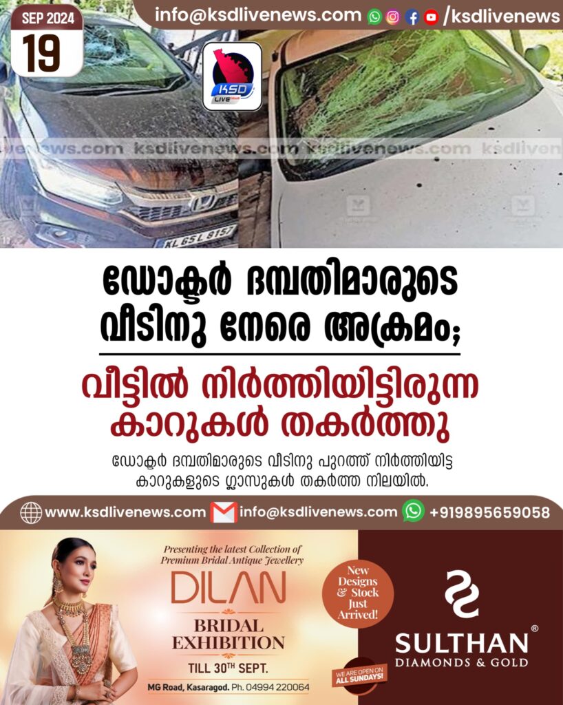 ഡോക്ടർ ദമ്പതിമാരുടെ വീടിനു നേരെ അക്രമം; വീട്ടിൽ നിർത്തിയിട്ടിരുന്ന കാറുകൾ തകർത്തു