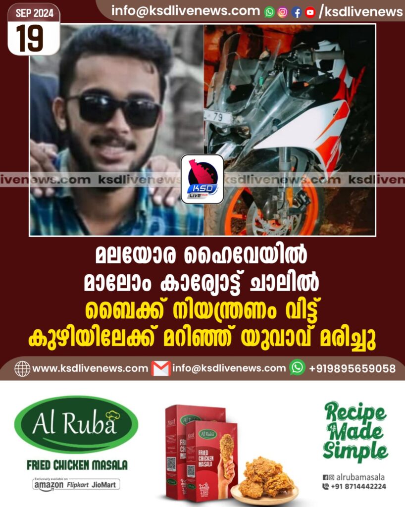 മലയോര ഹൈവേയിൽ മാലോം കാര്യോട്ട് ചാലിൽ ബൈക്ക് നിയന്ത്രണം വിട്ട് കുഴിയിലേക്ക് മറിഞ്ഞ് യുവാവ് മരിച്ചു