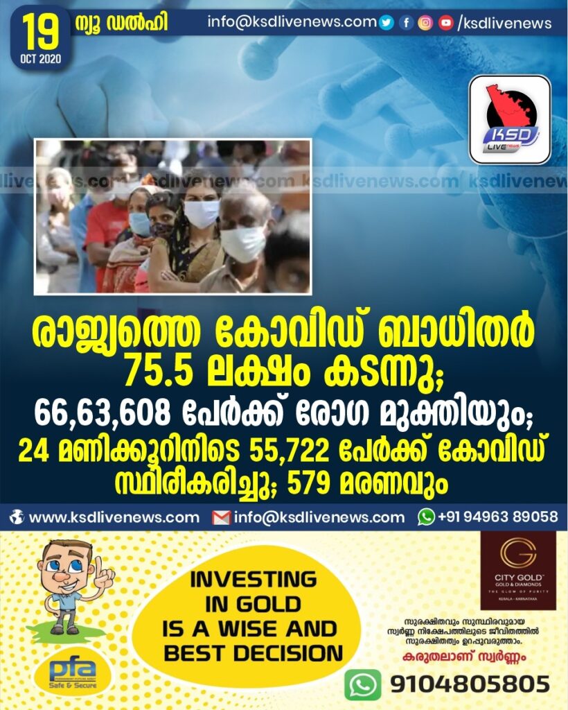 രാജ്യത്തെ കോവിഡ് ബാധിതർ 75.5 ലക്ഷം കടന്നു ; 66,63,608 പേർക്ക് രോഗ മുക്തിയും ;