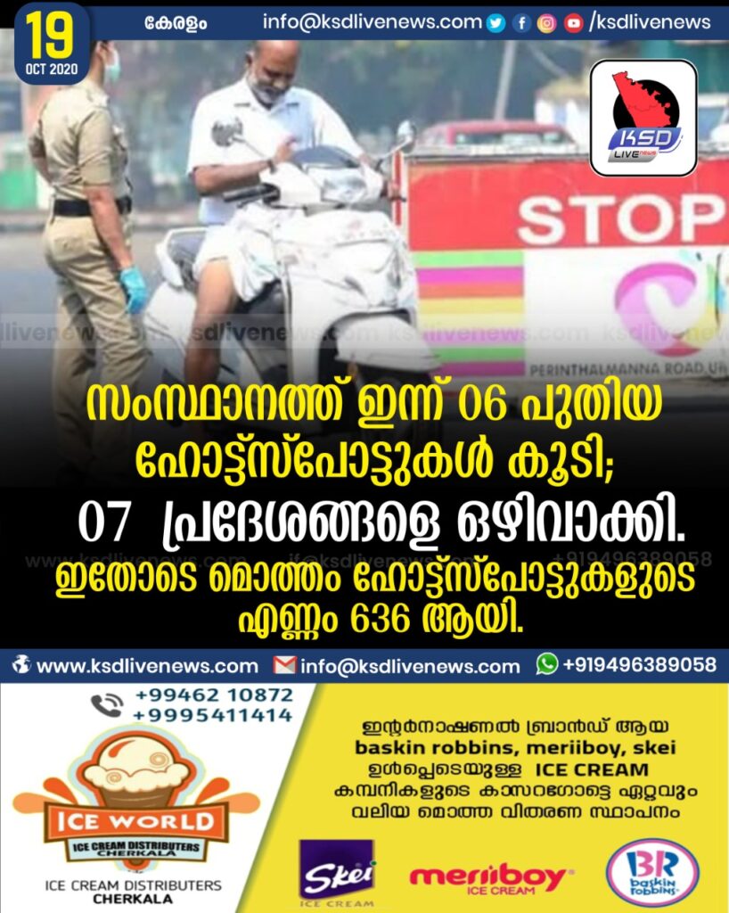 സംസ്ഥാനത്ത് ഇന്ന് 06 പുതിയ ഹോട്ട്സ്പോട്ടുകള് കൂടി; 07 പ്രദേശങ്ങളെ ഒഴിവാക്കി.ഇതോടെ മൊത്തം ഹോട്ട്സ്പോട്ടുകളുടെ എണ്ണം 636 ആയി.
