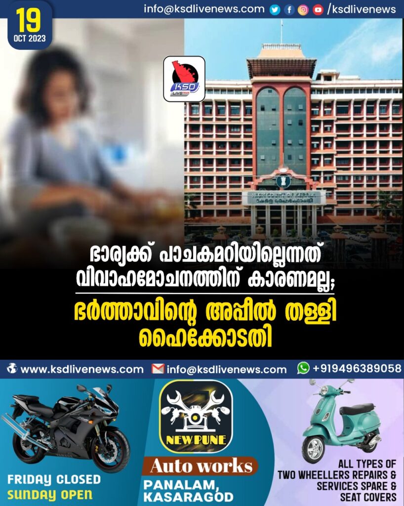 ഭാര്യക്ക് പാചകമറിയില്ലെന്നത് വിവാഹമോചനത്തിന് കാരണമല്ല;ഭര്ത്താവിന്റെ അപ്പീല് തള്ളി ഹൈക്കോടതി