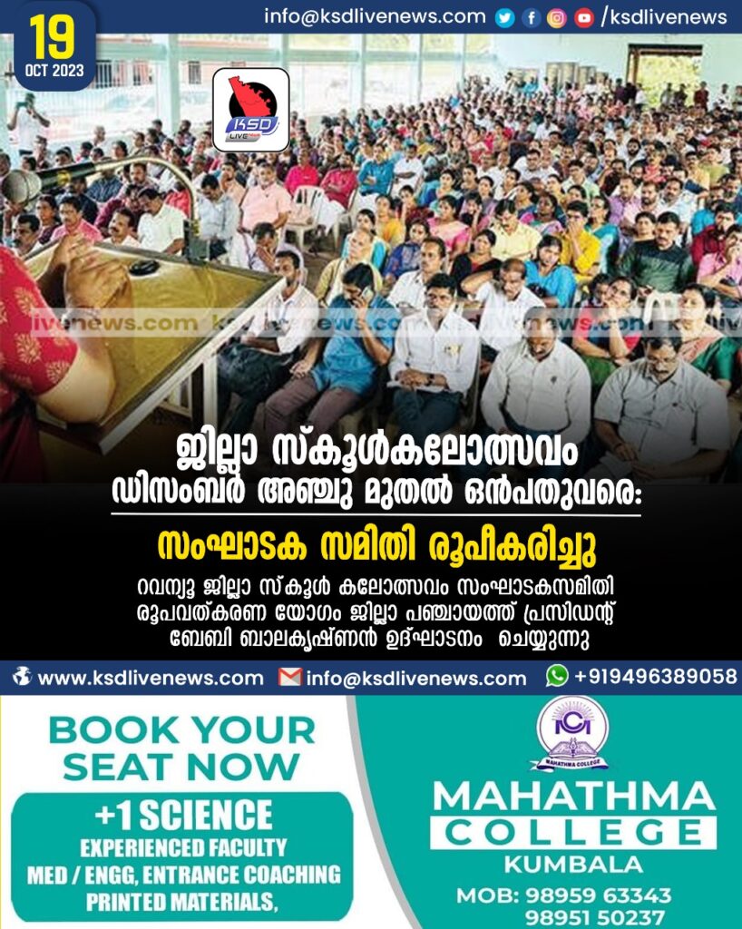 ജില്ലാ സ്കൂൾകലോത്സവം ഡിസംബർ അഞ്ചുമുതൽ ഒൻപതുവരെ: സംഘാടക സമിതി രൂപീകരിച്ചു