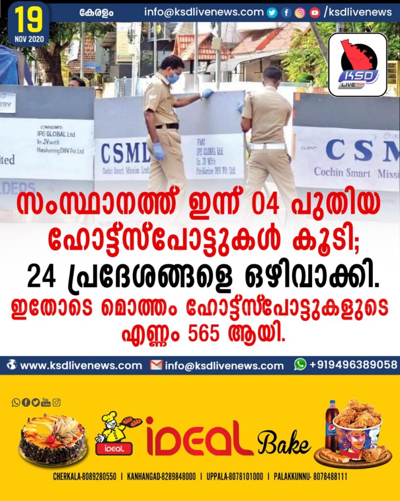 സംസ്ഥാനത്ത് ഇന്ന് 04 പുതിയ ഹോട്ട്സ്പോട്ടുകള്‍ കൂടി; 24 പ്രദേശങ്ങളെ ഒഴിവാക്കി. ഇതോടെ മൊത്തം ഹോട്ട്‌സ്‌പോട്ടുകളുടെ എണ്ണം 565 ആയി.