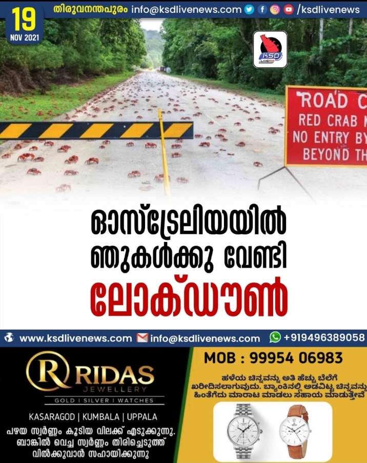മെൽബൺ : അഞ്ചുകോടി ചുവന്ന ഭീമൻ ഞണ്ടുകൾ. എല്ലാ വർഷവും നവംബറിലെ മഴയ്ക്കുശേഷം അവർ കൂട്ടംകൂട്ടമായി കാട്ടിൽനിന്ന് ഇറങ്ങും. റോഡു മുറിച്ചുകടന്ന് പ്രജനനത്തിനായി കടലിലേക്ക് യാത്രചെയ്യും. ഇവരുടെ സുരക്ഷിതമായ യാത്ര ഉറപ്പാക്കുന്നതിനായി ലോക്ഡൗൺ പ്രഖ്യാപിച്ചിരിക്കയാണ് ഒരു പ്രദേശം. പടിഞ്ഞാറൻ ഓസ്‌ട്രേലിയയിലെ ക്രിസ്മസ് ദ്വീപാണ് ഞണ്ടുകൾക്കായി അടച്ചിട്ടിരിക്കുന്നത്.