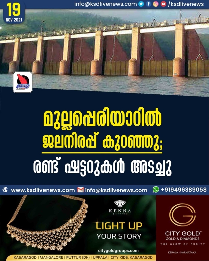 മുല്ലപ്പെരിയാറില്‍ ജലനിരപ്പ് കുറഞ്ഞു; രണ്ട് ഷട്ടറുകള്‍ അടച്ചു