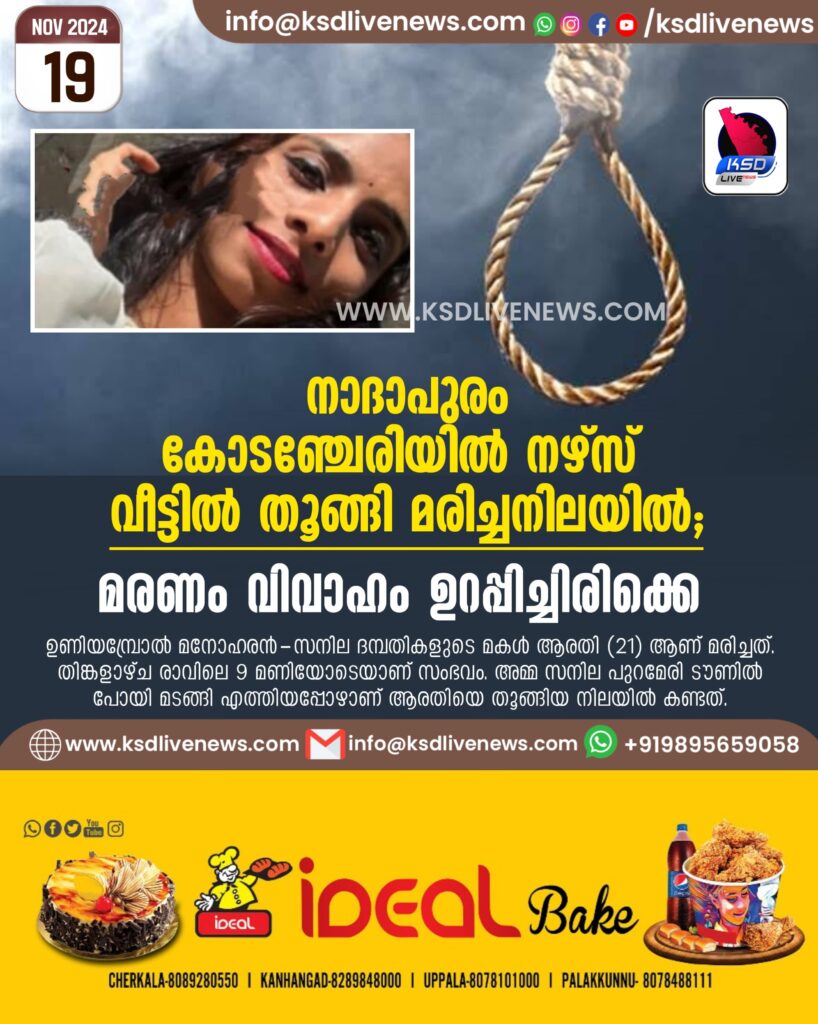 ഉടൻ നാദാപുരം ഗവ.താലൂക്ക് ആശുപത്രിയിൽ എത്തിച്ചെങ്കിലും രക്ഷിക്കാനായില്ല. കണ്ണൂരിലെ സ്വകാര്യ ആശുപത്രിയിൽ നഴ്സായി ജോലി ചെയ്യുകയായിരുന്നു. അടുത്തിടെയാണ് ആരതിയുടെ വിവാഹം ഉറപ്പിച്ചത്. സംഭവത്തിൽ പൊലീസ് അന്വേഷണം തുടങ്ങി. ആതിരയാണ് സഹോദരി.