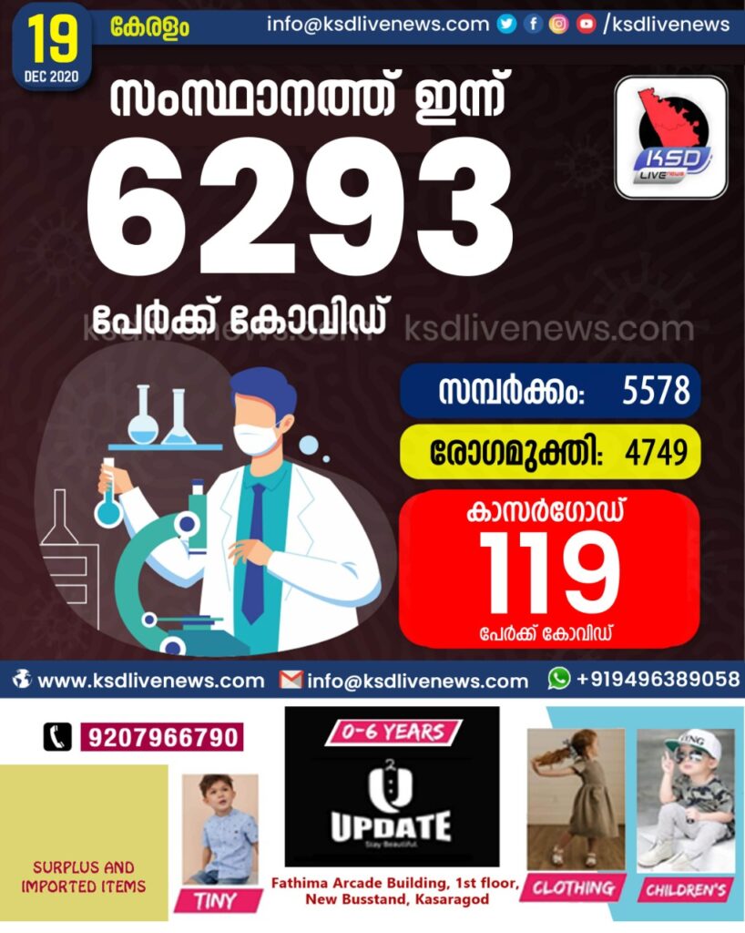 സംസ്ഥാനത്ത് ഇന്ന് 6293 പേർക്ക് കോവിഡ് സ്ഥിരീകരിച്ചു. സമ്പർക്കം വഴി 5578 പേർക്കും ; ആശ്വാസമായി 4749 പേർക്ക് രോഗ മുക്തിയും ; കാസർഗോഡ് ജില്ലയിൽ 119 പേർക്ക് പുതിയ കോവിഡ് കേസുകൾ ; മരണം 29