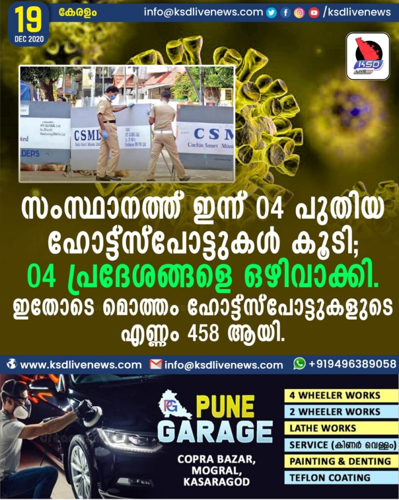സംസ്ഥാനത്ത് ഇന്ന് 04 പുതിയ ഹോട്ട്സ്പോട്ടുകള്‍ കൂടി; 04 പ്രദേശങ്ങളെ ഒഴിവാക്കി. ഇതോടെ മൊത്തം ഹോട്ട്‌സ്‌പോട്ടുകളുടെ എണ്ണം 458 ആയി.