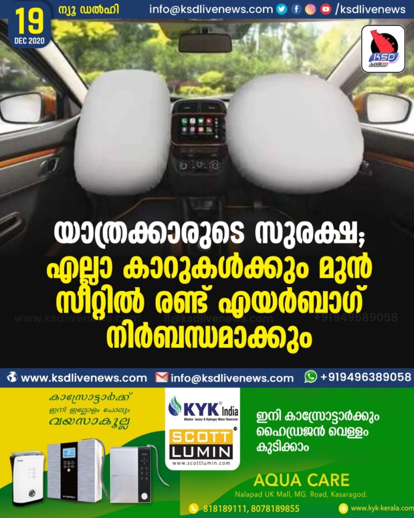 യാത്രക്കാരുടെ സുരക്ഷ ; എല്ലാ കാറുകൾക്കും മുൻ സീറ്റിൽ രണ്ട് എയർബാഗ് നിർബന്ധമാക്കും