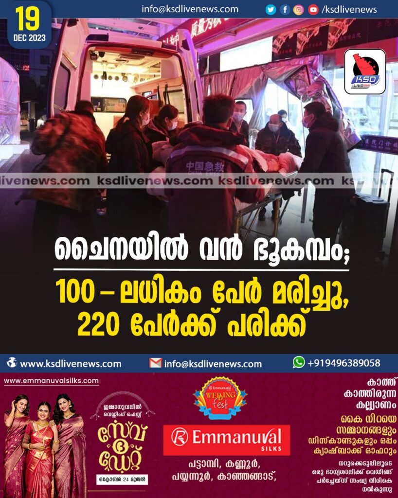 ചൈനയില് വന് ഭൂകമ്പം; 100-ലധികം പേര് മരിച്ചു, 220 പേര്ക്ക് പരിക്ക്