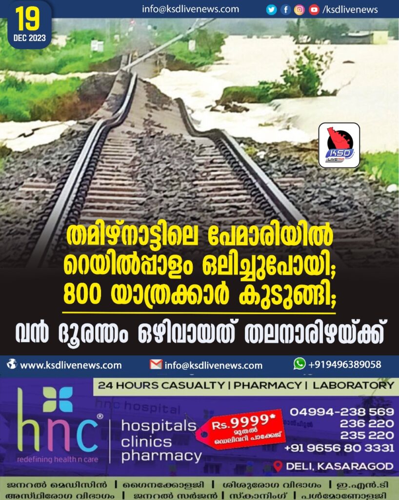 തമിഴ്നാട്ടിലെ പേമാരിയിൽ റെയിൽപ്പാളം ഒലിച്ചുപോയി; 800 യാത്രക്കാർ കുടുങ്ങി; വൻ ദൂരന്തം ഒഴിവായത് തലനാരിഴയ്ക്ക്