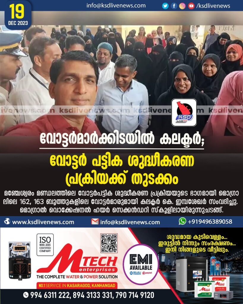 മൊഗ്രാൽ: മഞ്ചേശ്വരം മണ്ഡലത്തിലെ വോട്ടർപട്ടിക ശുദ്ധീകരണ പ്രക്രിയയുടെ ഭാഗമായി മൊഗ്രാലിലെ 162, 163 ബൂത്തുകളിലെ വോട്ടർമാരുമായി കലക്ടർ കെ. ഇമ്പശേഖർ സംവദിച്ചു. മൊഗ്രാൽ വൊക്കേഷനൽ ഹയർ സെക്കൻഡറി സ്കൂളിലായിരുന്നു ചടങ്ങ്. മരിച്ചുപോയവരെ വോട്ടർ പട്ടികയിൽനിന്ന് ഒഴിവാക്കുന്നതിനും ജനാധിപത്യപ്രക്രിയയിൽ തെരഞ്ഞെടുപ്പുകളിൽ വോട്ടിങ് ശതമാനം കൂട്ടുന്നതിനുമായാണ് മണ്ഡലംതോറും കലക്ടറുടെ നേതൃത്വത്തിൽ ഇത്തരത്തിൽ പരിപാടി സംഘടിപ്പിക്കുന്നത്.