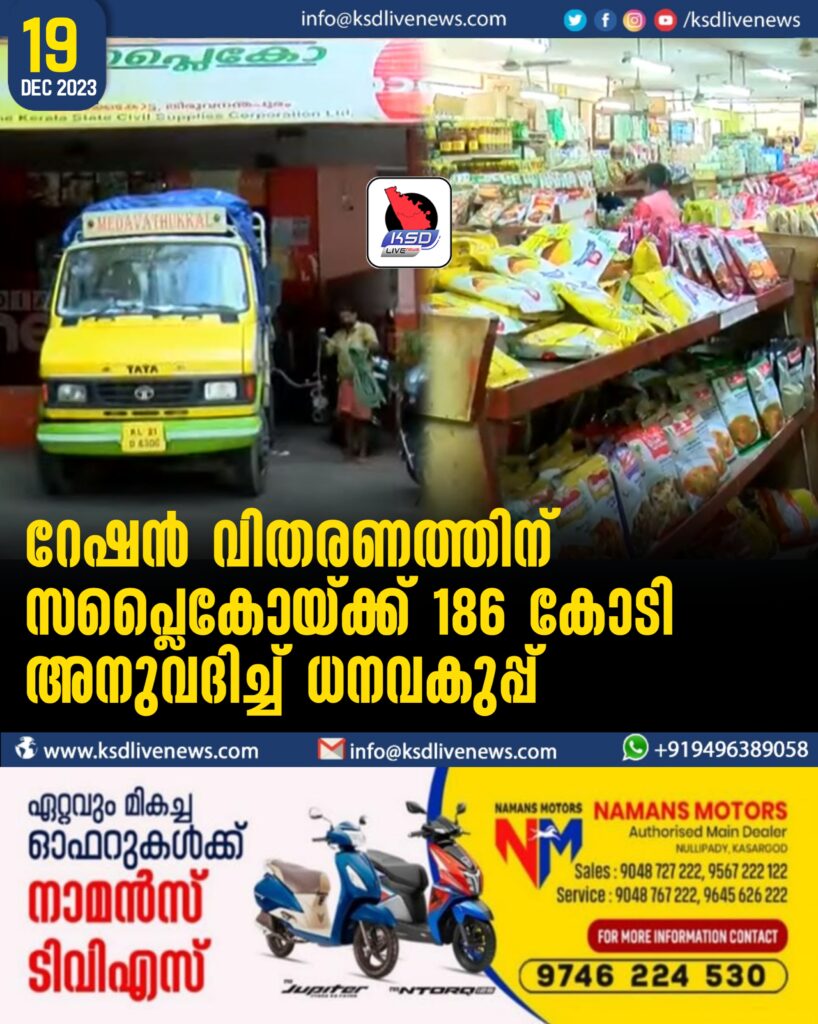 റേഷൻ വിതരണത്തിന് സപ്ലൈകോയ്ക്ക് 186 കോടി അനുവദിച്ച് ധനവകുപ്പ്