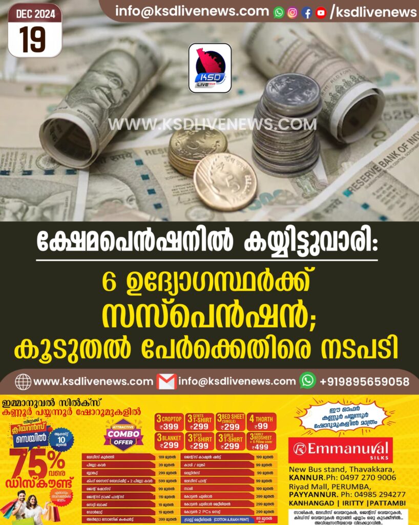 ക്ഷേമപെൻഷനിൽ കയ്യിട്ടുവാരി, 6 ഉദ്യോഗസ്ഥർക്ക് സസ്പെൻഷൻ; കൂടുതൽ പേർക്കെതിരെ നടപടി