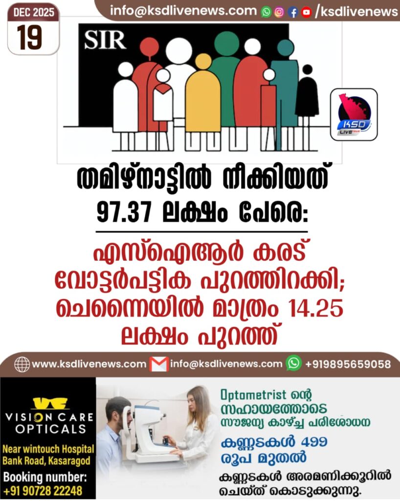 തമിഴ്നാട്ടിൽ നീക്കിയത് 97.37 ലക്ഷം പേരെ: എസ്ഐആർ കരട് വോട്ടർപട്ടിക പുറത്തിറക്കി; ചെന്നൈയിൽ മാത്രം 14.25 ലക്ഷം പുറത്ത്