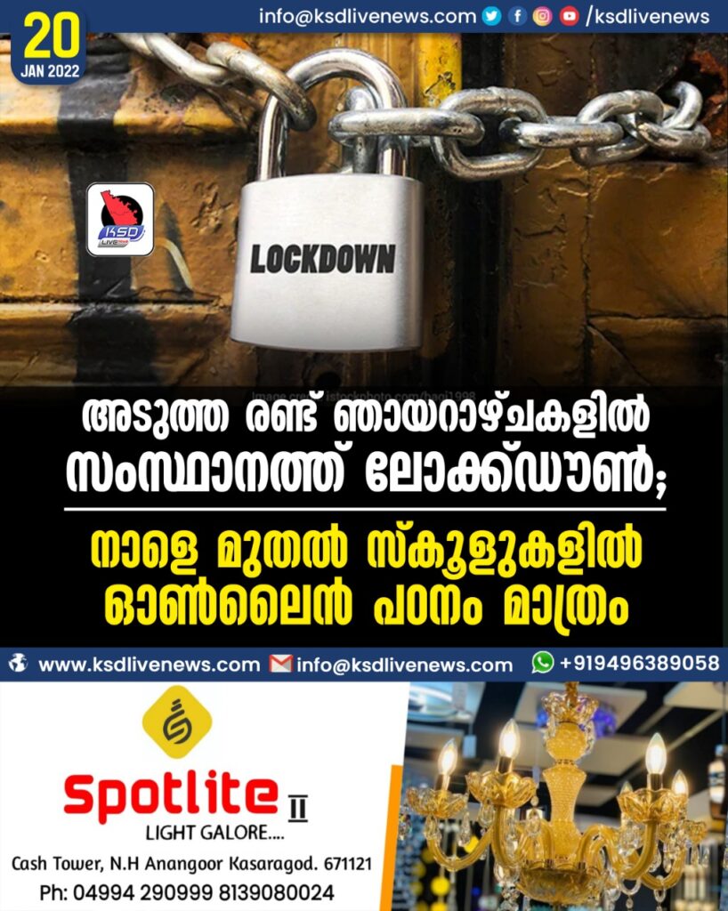നേരത്തെ പ്രഖ്യാപിച്ചതിനുസരിച്ച് ഒന്ന് മുതൽ ഒമ്പതാം ക്ലാസ് വരെയുള്ളവർക്ക് നാളെ മുതൽ ഓൺലൈൺ ക്ലാസുകൾ ആരംഭിക്കും. സി കാറ്റഗറിയിൽ വരുന്ന ജില്ലകളിൽ മാത്രം ബിരുദം ( ഒന്നും രണ്ടും വർഷം ) ബിരുദാനന്തര ബിരുദം ( ആദ്യ വർഷം) ക്ലാസുകളും പ്ലസ് വൺ ക്ലാസുകളും ഓൺലൈൻ സംവിധാനത്തിലേക്ക് മാറും. നിലവിൽ ഈ കാറ്റഗറിയിൽ ഒരു ജില്ലയും ഉൾപ്പെട്ടിട്ടില്ല.
