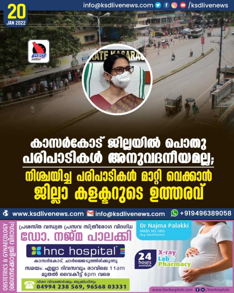 കാസർകോട് ജില്ലയിൽ പൊതു പരിപാടികൾ അനുവദനീയമല്ല ; നിശ്ചയിച്ച പരിപാടികൾ മാറ്റി വെക്കാൻ ജില്ലാ കളക്ടറുടെ ഉത്തരവ്