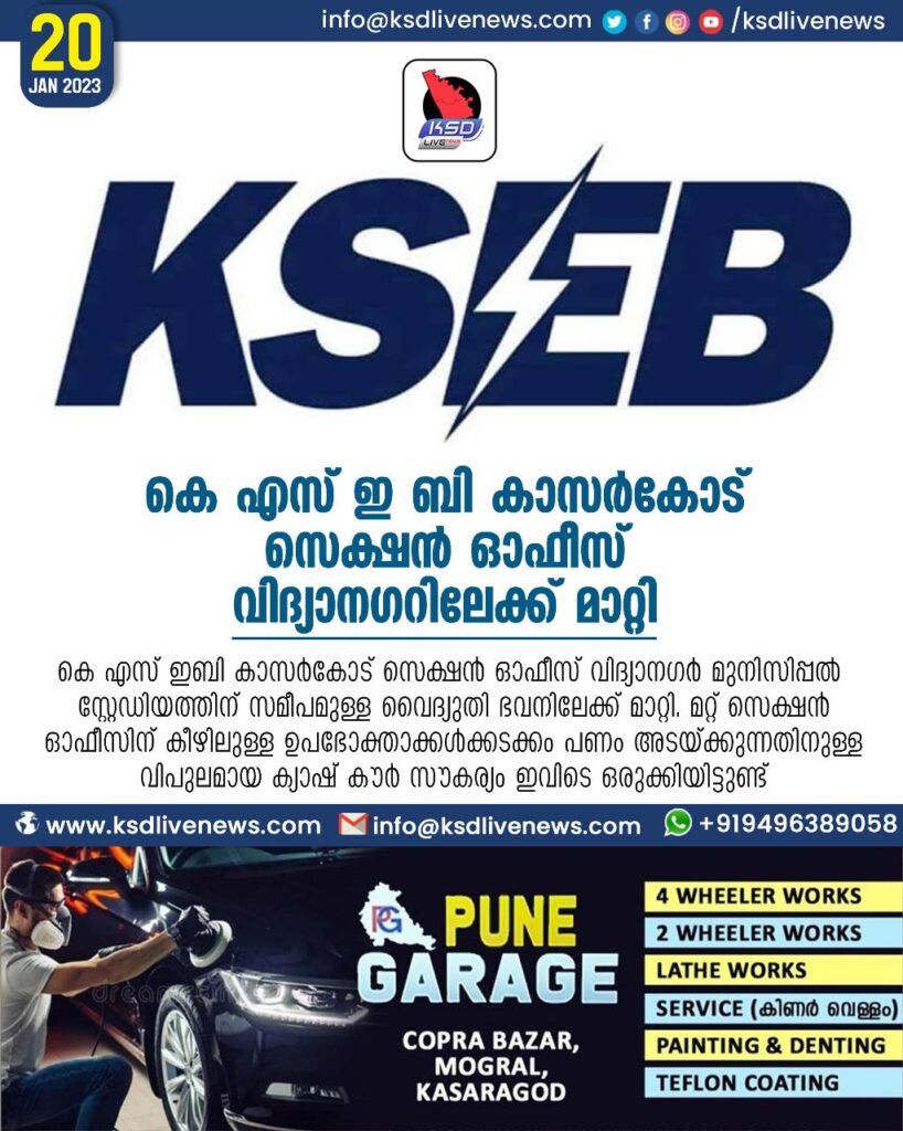 കെ എസ് ഇ ബി കാസര്കോട് സെക്ഷന് ഓഫീസ് വിദ്യാനഗറിലേക്ക് മാറ്റി