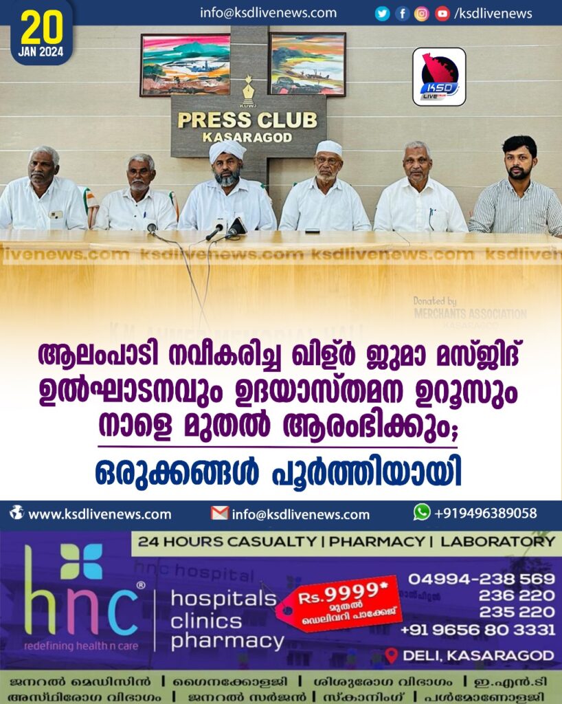 ആലംപാടി നവീകരിച്ച ഖിള്ർ ജുമാമസ്ജിദ് ഉൽഘാടനവും ഉദയാസ്തമനഉറൂസും നാളെ മുതൽ ആരംഭിക്കും; ഒരുക്കങ്ങൾ പൂർത്തിയായി