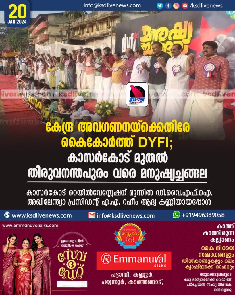 കേന്ദ്ര അവഗണനയ്ക്കെതിരേ കൈകോർത്ത് DYFI; കാസർകോട് മുതൽ തിരുവനന്തപുരം വരെ മനുഷ്യച്ചങ്ങല