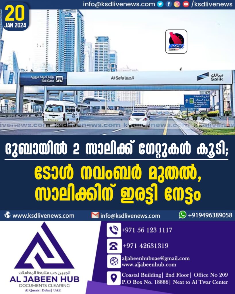ദുബായിൽ 2 സാലിക്ക് ഗേറ്റുകൾ കൂടി; ടോൾ നവംബർ മുതൽ, സാലിക്കിന് ഇരട്ടി നേട്ടം