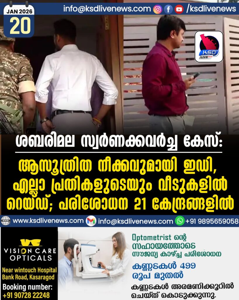 ശബരിമല സ്വര്‍ണക്കവര്‍ച്ച കേസ്: ആസൂത്രിത നീക്കവുമായി ഇഡി, എല്ലാ പ്രതികളുടെയും വീടുകളില്‍ റെയ്ഡ്; പരിശോധന 21 കേന്ദ്രങ്ങളില്‍