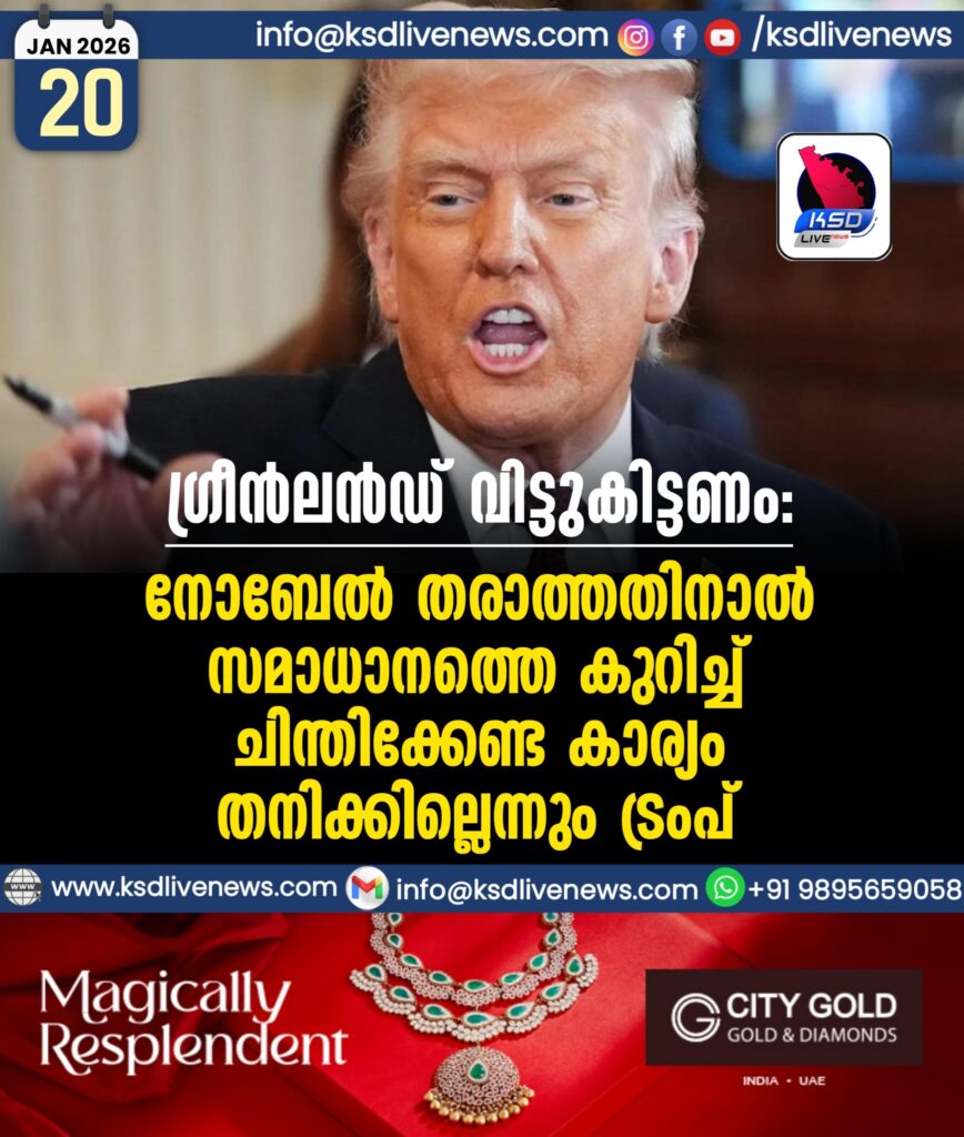 ഗ്രീന്ലന്ഡ് വിട്ടുകിട്ടണം; നോബേല് തരാത്തതിനാല് സമാധാനത്തെ കുറിച്ച് ചിന്തിക്കേണ്ട കാര്യം തനിക്കില്ലെന്നും ട്രംപ്