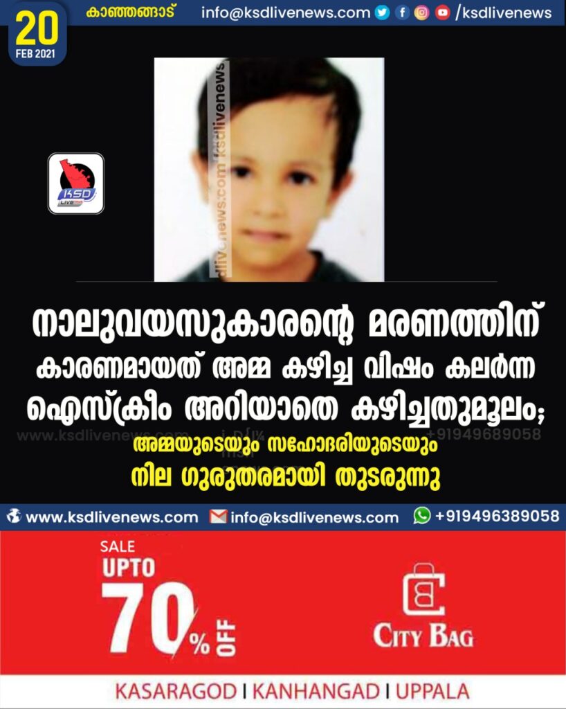 നാലുവയസുകാരന്റെ മരണത്തിന് കാരണമായത് അമ്മ കഴിച്ച വിഷം കലര്‍ന്ന ഐസ്‌ക്രീം അറിയാതെ കഴിച്ചതുമൂലം; അമ്മയുടെയും സഹോദരിയുടെയും നില ഗുരുതരമായി തുടരുന്നു