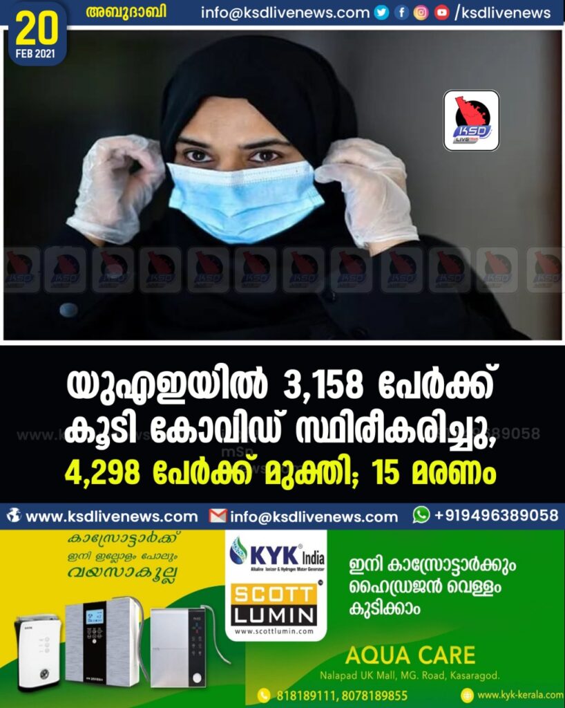 യുഎഇയില് 3,158 പേര്ക്ക് കൂടി കോവിഡ് സ്ഥിരീകരിച്ചു, 4,298 പേർക്ക് മുക്തി; 15 മരണം