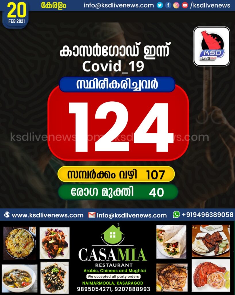 കാസർഗോഡ് ജില്ലയിൽ ഇന്ന് കോവിഡ് സ്ഥിരീകരിച്ചത് 124 പേർക്ക് : സമ്പർക്കം വഴി 107 പേർക്കും ; ജില്ലയിൽ ഇന്ന് രോഗ മുക്തി നേടിയവരുടെ 40 പേരാണെന്ന് മുഖ്യമന്ത്രി പിണറായി വിജയൻ അറിയിച്ചു