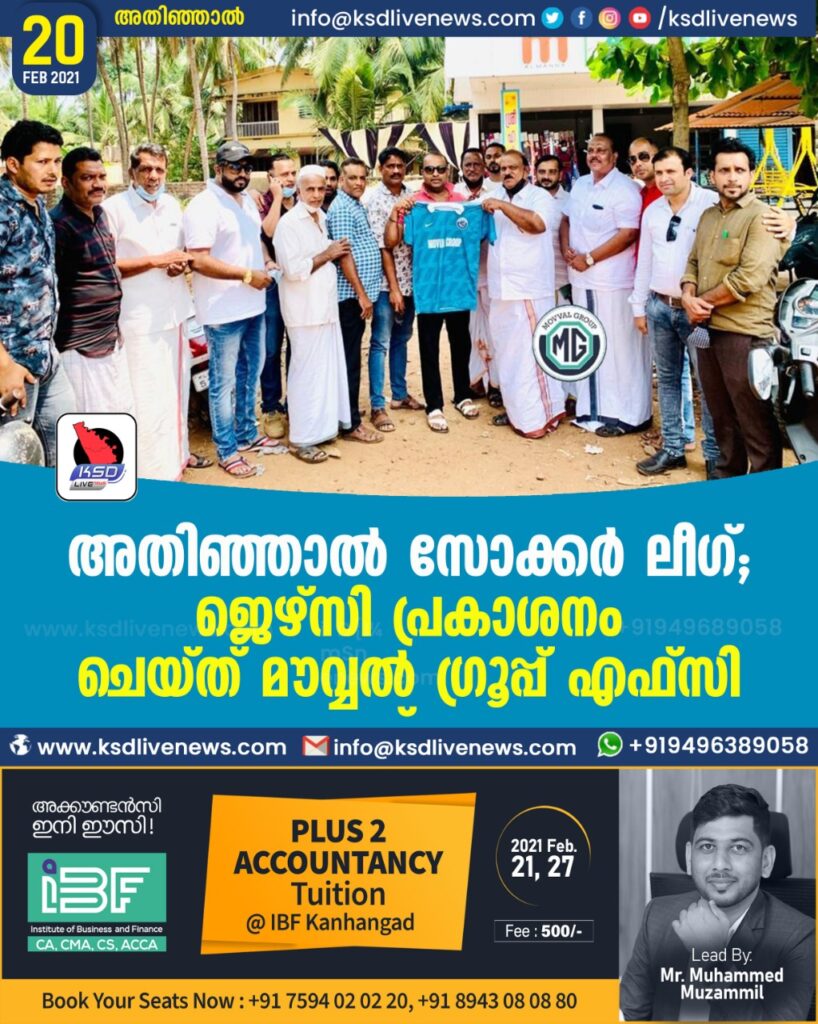 അതിഞ്ഞാൽ : ഫെബ്രുവരി 21 ഞാറായ്ച്ചയുടെ സായം സന്ധ്യയിൽ പാലക്കുന്ന് കിക്കോഫ് ടർഫ് ഫ്ലെഡ്ലൈറ്റ് സ്റ്റേഡിയത്തിൽ വെച്ച് അതിഞ്ഞാൽ പ്രദേശത്തെ ഫുട്ബോൾ പ്രതിഭകളെ അണിനിരത്തി അരങ്ങേറുന്ന നാലാമത് അതിഞ്ഞാൽ സോക്കർ ലീഗ് പോരാട്ടത്തിൽ മാറ്റുരയ്ക്കാനെത്തുന്ന ക്ലബ് മൗവ്വൽ ഗ്രൂപ്പ് എഫ്സിയുടെ ടീം ജെഴ്സി പ്രകാശനം ചെയ്തു.