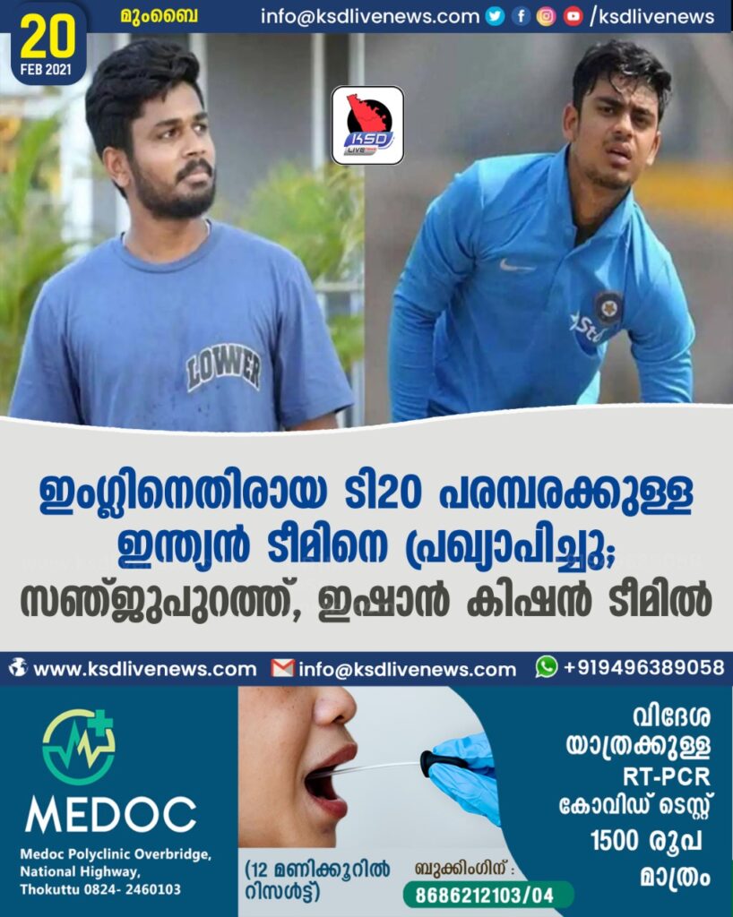 ഇംഗ്ലണ്ടിനെതിരായ ടി 20 പരമ്ബരക്കുള്ള ഇന്ത്യൻ ടീമിനെ പ്രഖ്യാപിച്ചു ; സഞ്ജ പുറത്ത് , ഇഷാൻ കിഷൻ ടീമിൽ