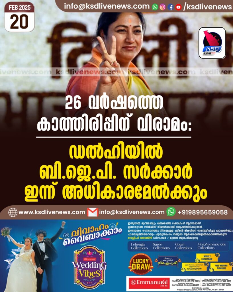 26 വര്ഷത്തെ കാത്തിരിപ്പിന് വിരാമം, ഡല്ഹിയില് ബി.ജെ.പി.സര്ക്കാര് ഇന്ന് അധികാരമേല്ക്കും