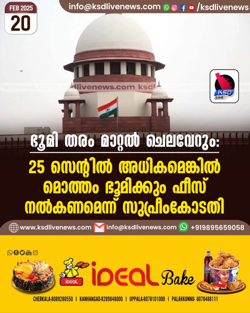 ഭൂമി തരം മാറ്റൽ ചെലവേറും: 25 സെന്റിൽ അധികമെങ്കിൽ മൊത്തം ഭൂമിക്കും ഫീസ് നൽകണമെന്ന് സുപ്രീം കോടതി