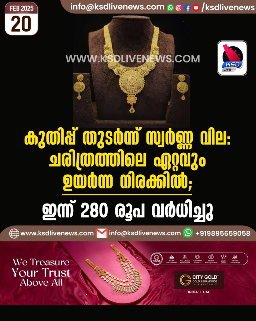 കുതിപ്പ് തുടർന്ന് സ്വർണ്ണ വില: ചരിത്രത്തിലെ ഏറ്റവും ഉയർന്ന നിരക്കിൽ; ഇന്ന് 280 രൂപ വര്ധിച്ചു