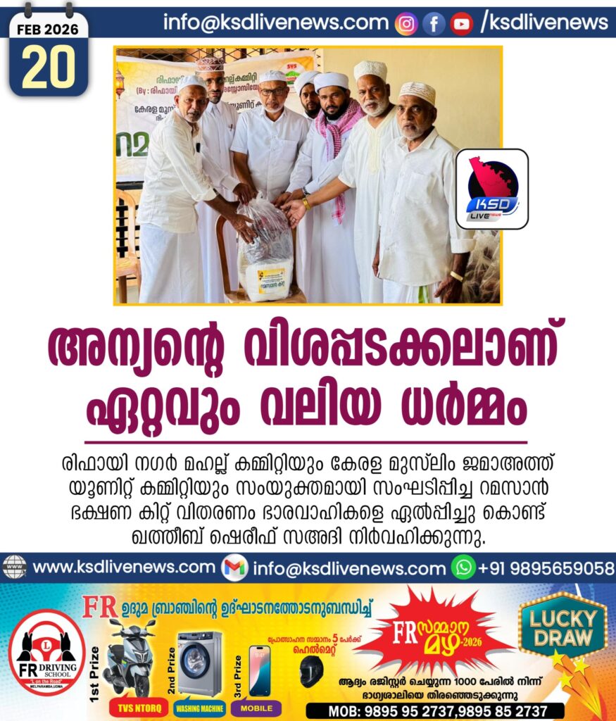 രിഫായിയാ മുസ്ലിം അസോസിയേഷന് കീഴിലുള്ള രിഫായിയ്യ സുന്നി മഹല്ല് കമ്മിറ്റിയും കേരള മുസ്ലിം ജമാഅത്ത്, എസ് വൈ എസ്, എസ് എസ് എഫ് യൂണിറ്റ് കമ്മിറ്റികളും സംയുക്തമായി സംഘടിപ്പിച്ച റമസാൻ ഭക്ഷണക്കിറ്റ് വിതരണ ചടങ്ങ് ഉദ്ഘാടനം ചെയ്തു സംസാരിക്കുകയായിരുന്നു അദ്ദേഹം. എഴുപതോളം വീട്ടുകാർക്ക് കിറ്റ് വിതരണം ചെയ്തു.