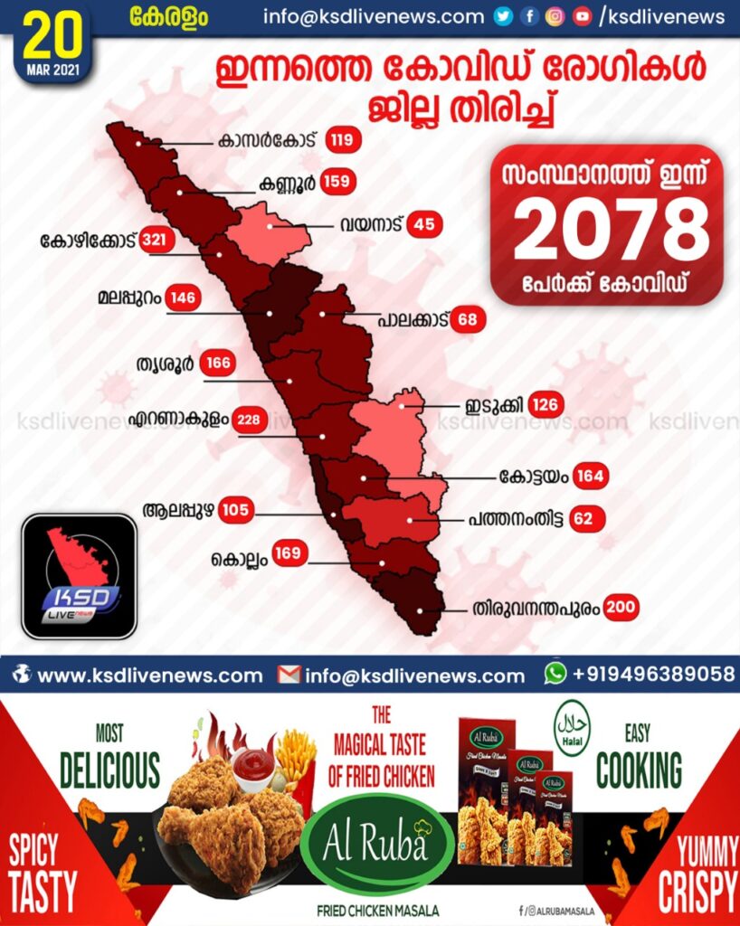 സംസ്ഥാനത്ത് ഇന്ന് 2078 പേര്ക്ക് കോവിഡ്-19 സ്ഥിരീകരിച്ചു. കോഴിക്കോട് 321, എറണാകുളം 228, തിരുവനന്തപുരം 200, കൊല്ലം 169, തൃശൂര് 166, കോട്ടയം 164, കണ്ണൂര് 159, മലപ്പുറം 146, ഇടുക്കി 126, കാസര്ഗോഡ് 119, ആലപ്പുഴ 105, പാലക്കാട് 68, പത്തനംതിട്ട 62, വയനാട് 45 എന്നിങ്ങനേയാണ് ജില്ലകളില് ഇന്ന് രോഗ ബാധ സ്ഥിരീകരിച്ചത്.