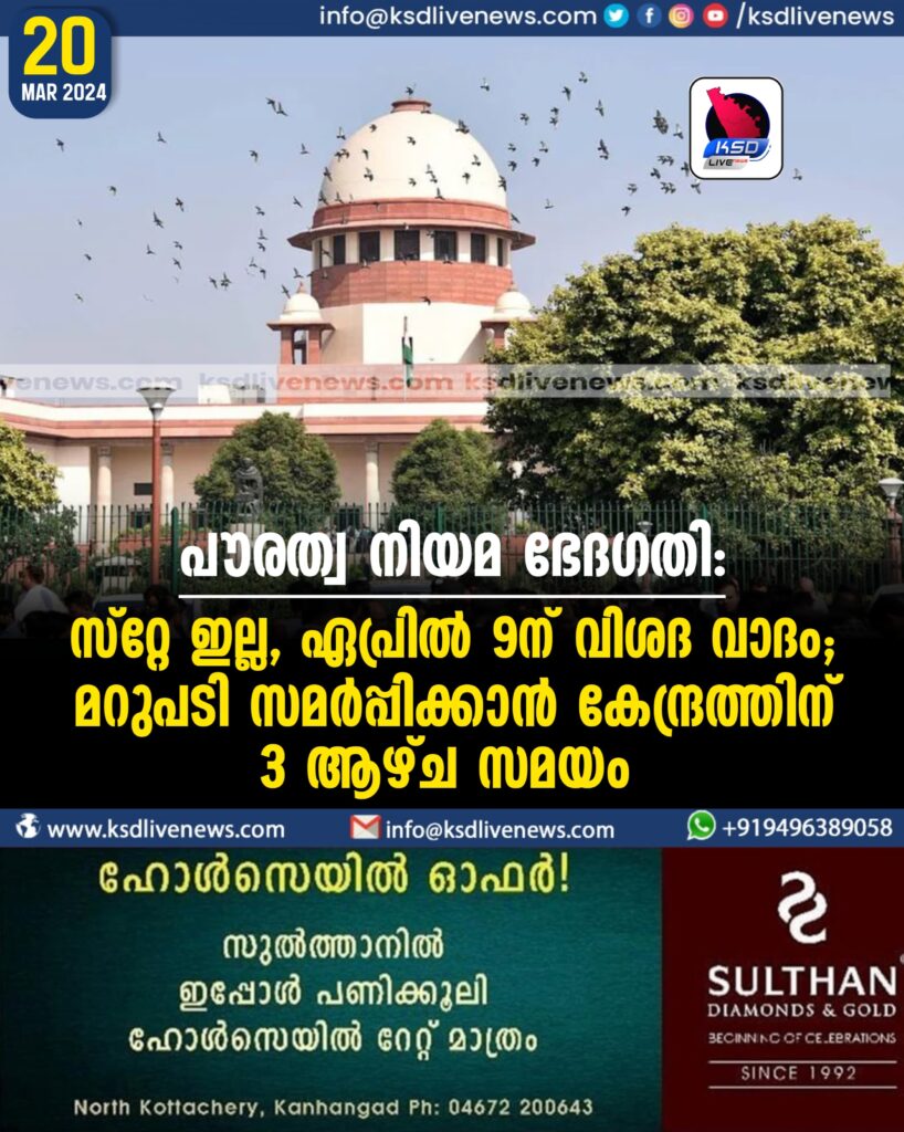 പൗരത്വ നിയമ ഭേദഗതി: സ്റ്റേ ഇല്ല, ഏപ്രില്‍ 9ന് വിശദ വാദം; മറുപടി സമർപ്പിക്കാൻ കേന്ദ്രത്തിന് 3 ആഴ്ച സമയം
