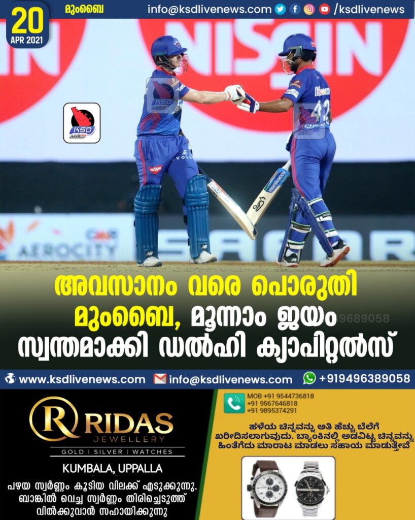 അവസാനം വരെ പൊരുതി മുംബൈ, മൂന്നാം ജയം സ്വന്തമാക്കി ഡല്ഹി ക്യാപിറ്റല്സ്